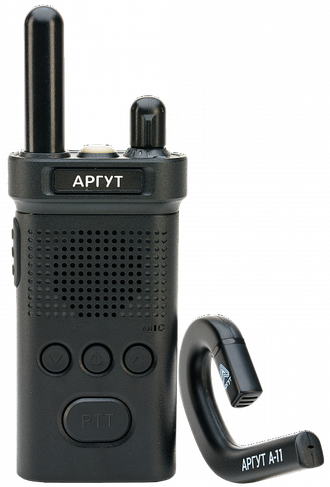 - Приёмопередатчик Аргут А-11 с присоединённой клипсой, встроенной антенной и аккумуляторной батареей